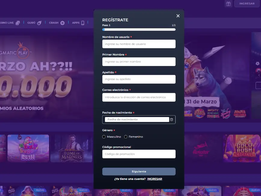 Necesitarás ingresar tu nombre completo, dirección de correo electrónico, número de teléfono y una contraseña segura. Este proceso es fundamental para garantizar la seguridad de tu cuenta y cumplir con las normativas de juego responsable.