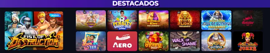 | 🎲 Juegos de casino | Tragamonedas, casino en vivo, video bingo, juegos originales como Aero y Plinko. |