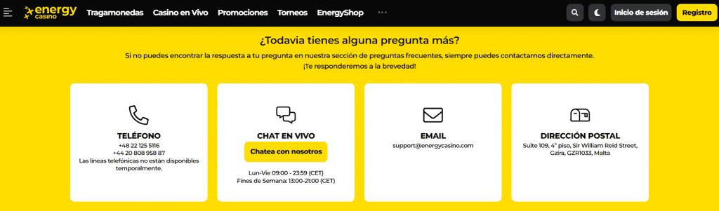 - 📧 Correo Electrónico: Puedes enviar tus preguntas a support@energycasino.com. Ideal para consultas no urgentes o cuando necesitas enviar documentación.