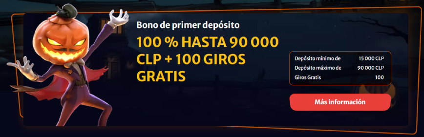 | 🎁 Bonos | Bono de primer depósito: 100% hasta 90.000 CLP + 100 giros gratis. Segundo depósito: 50% hasta 250.000 CLP + 50 giros gratis |