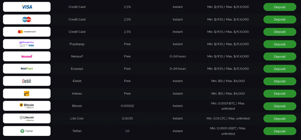 - 💰 Maestro y Mastercard: Depósito mínimo de 10€ y máximo de 4,000€. Tasa del 2.5%.