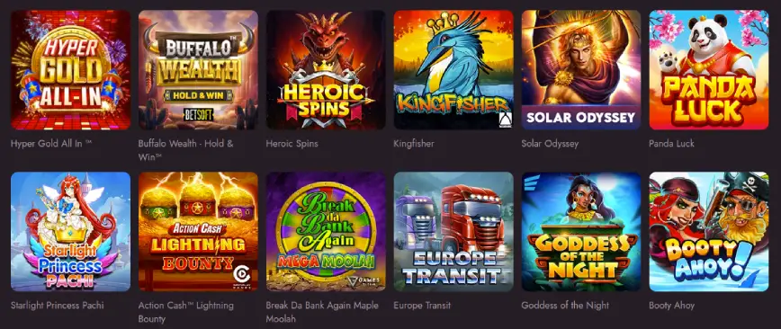 - 🎲 Tragamonedas: Más de 2,500 títulos disponibles. Tragamonedas clásicas y modernas con diversos temas como frutas, aventura, y fantasía. Títulos populares incluyen Booming Bananas, Master Joker, y Triple Chilli.