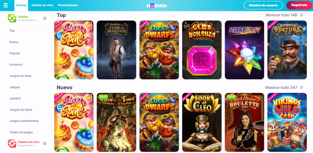 Desde el momento en que uno ingresa a Nomini Casino, es evidente que han puesto un gran esfuerzo en crear una interfaz atractiva y fácil de navegar. Los colores vivos y los gráficos llamativos son la primera cosa que salta a la vista, y cada sección del casino está claramente marcada y accesible desde la página principal. La velocidad de carga de las páginas es rápida, lo cual es fundamental para mantener la fluidez de la experiencia de juego.Los juegos están categorizados por tipo, popularidad y proveedor, facilitando encontrar tus preferencias o descubrir nuevos juegos.