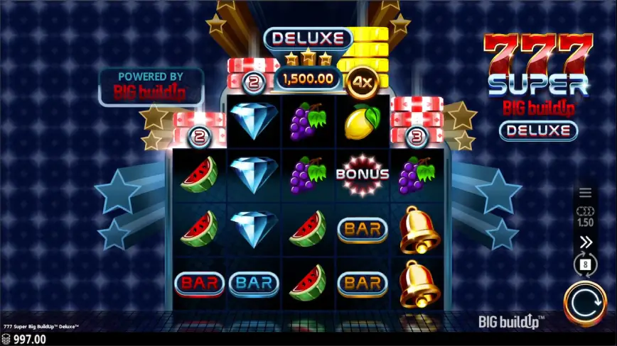 La flexibilidad es clave cuando se trata de apuestas, y 777 Super Big BuildUp Deluxe lo tiene cubierto. La apuesta máxima es de 30.00 €, lo que permite a los jugadores de diferentes niveles financieros disfrutar del juego. Además, las ganancias pueden alcanzar hasta 3,000 veces la apuesta, lo que representa una oportunidad significativa para obtener grandes premios.