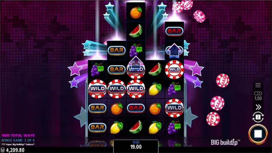 La verdadera emoción llega cuando la función Big Buildup se activa, otorgando pagos basados en el valor de las fichas acumuladas. Con la posibilidad de un Premio Deluxe de hasta 3,000 veces tu apuesta, esta función es verdaderamente un cambio de juego.