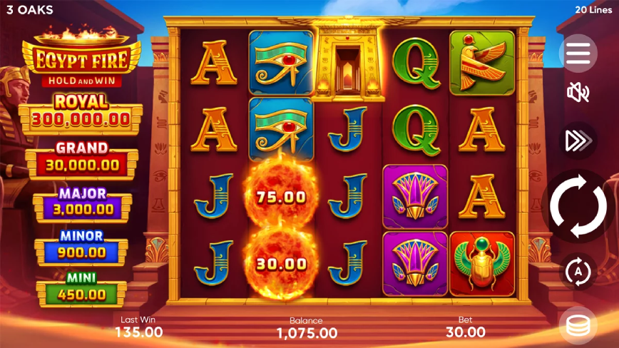 Las características especiales de la tragamonedas Egypt Fire son el alma del juego, ofreciendo múltiples oportunidades para aumentar las ganancias. Este juego, desarrollado por 3 Oaks, se basa en la popular mecánica Hold and Win, que ha capturado la atención de muchos jugadores en todo el mundo. Con un tema egipcio bien diseñado, tragaperras nos transporta a las antiguas tumbas y pirámides, ofreciendo una experiencia visualmente atractiva y emocionante.